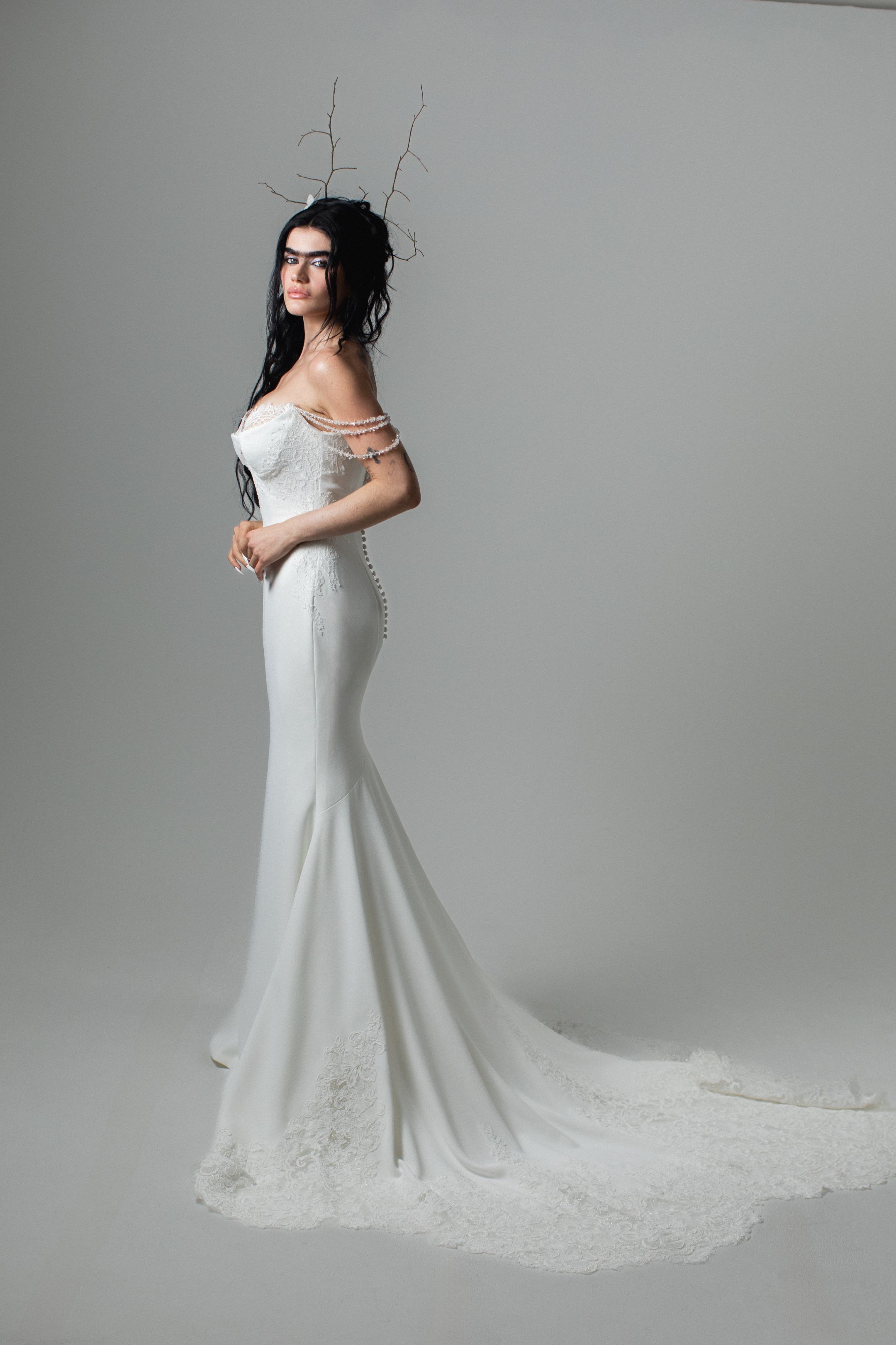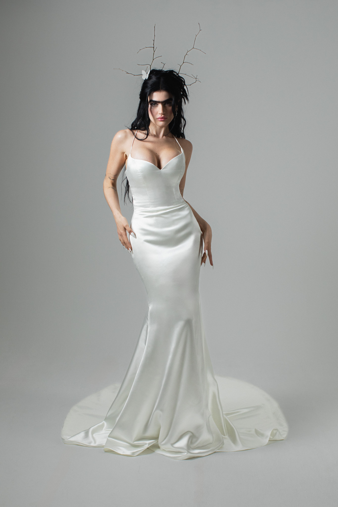 Helena is cut in bone-white crepe, its silhouette sharply fitted, flaring into a train etched with lace cut-outs. At its centre, a diamond-shaped cut-out opens over the chest – a window, a wound, a portal. Suspended within it, a single raw quartz crystal glows like a talisman.