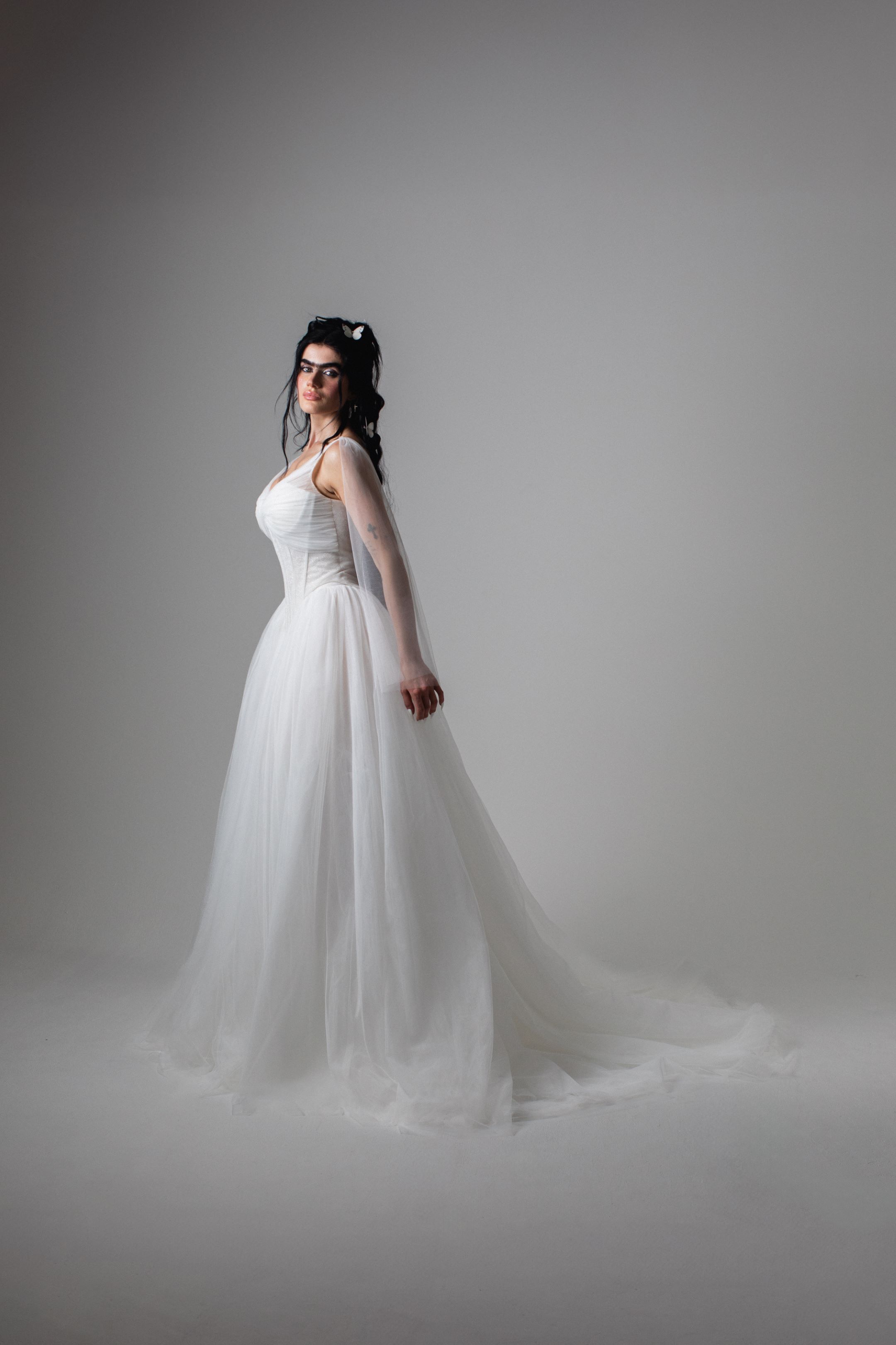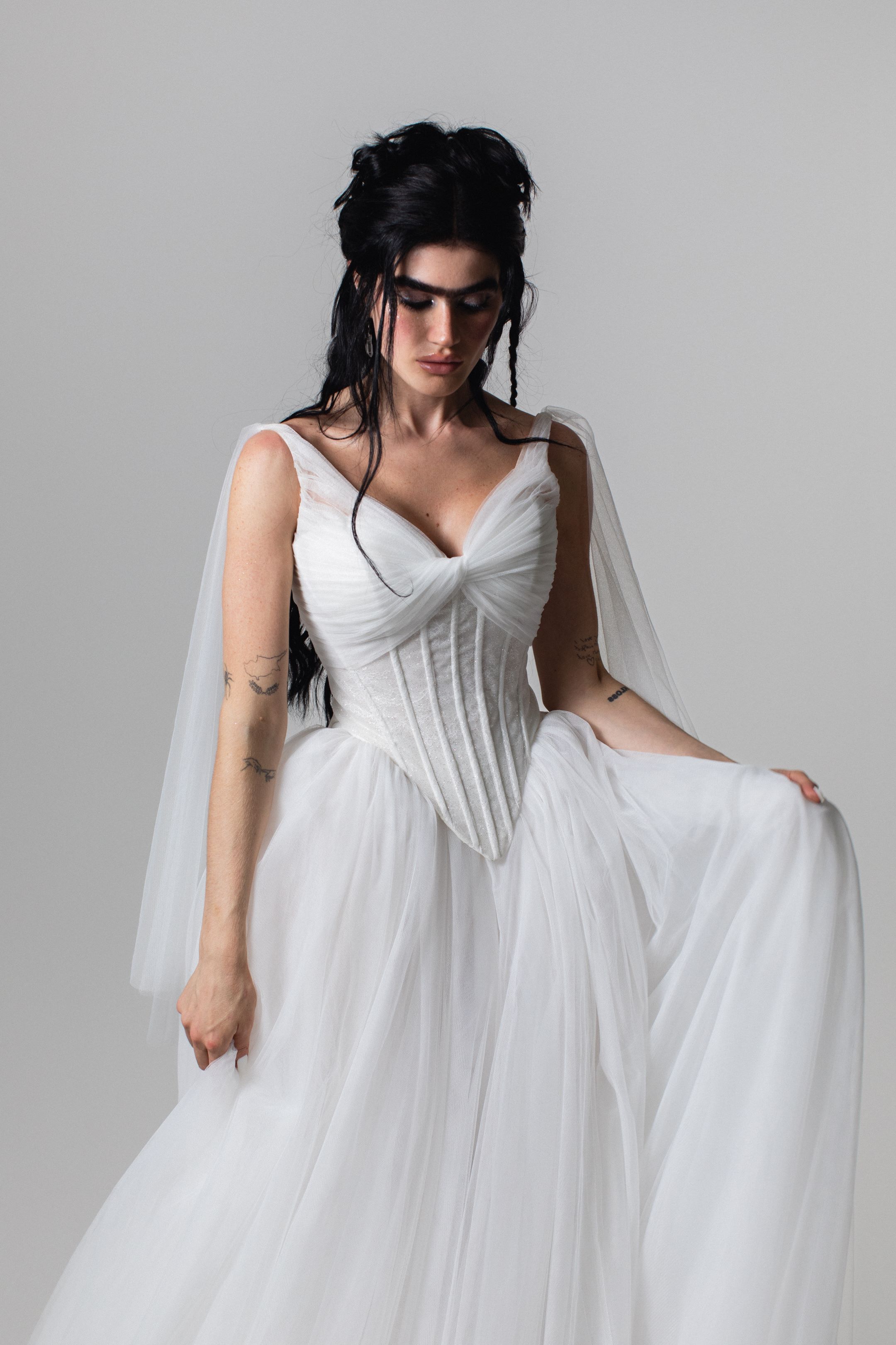 A silk tulle skirt with micro-pleating ripples like sea foam, moving with the softness of waves. Above, an exposed corset shows strength, softened with floral lace – a nod to her herbal knowledge, once revered, then feared. She was tortured. She was silenced. But Agnes endures – the storm returned, soft, sacred, unbroken.